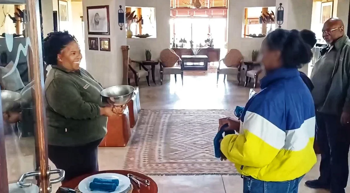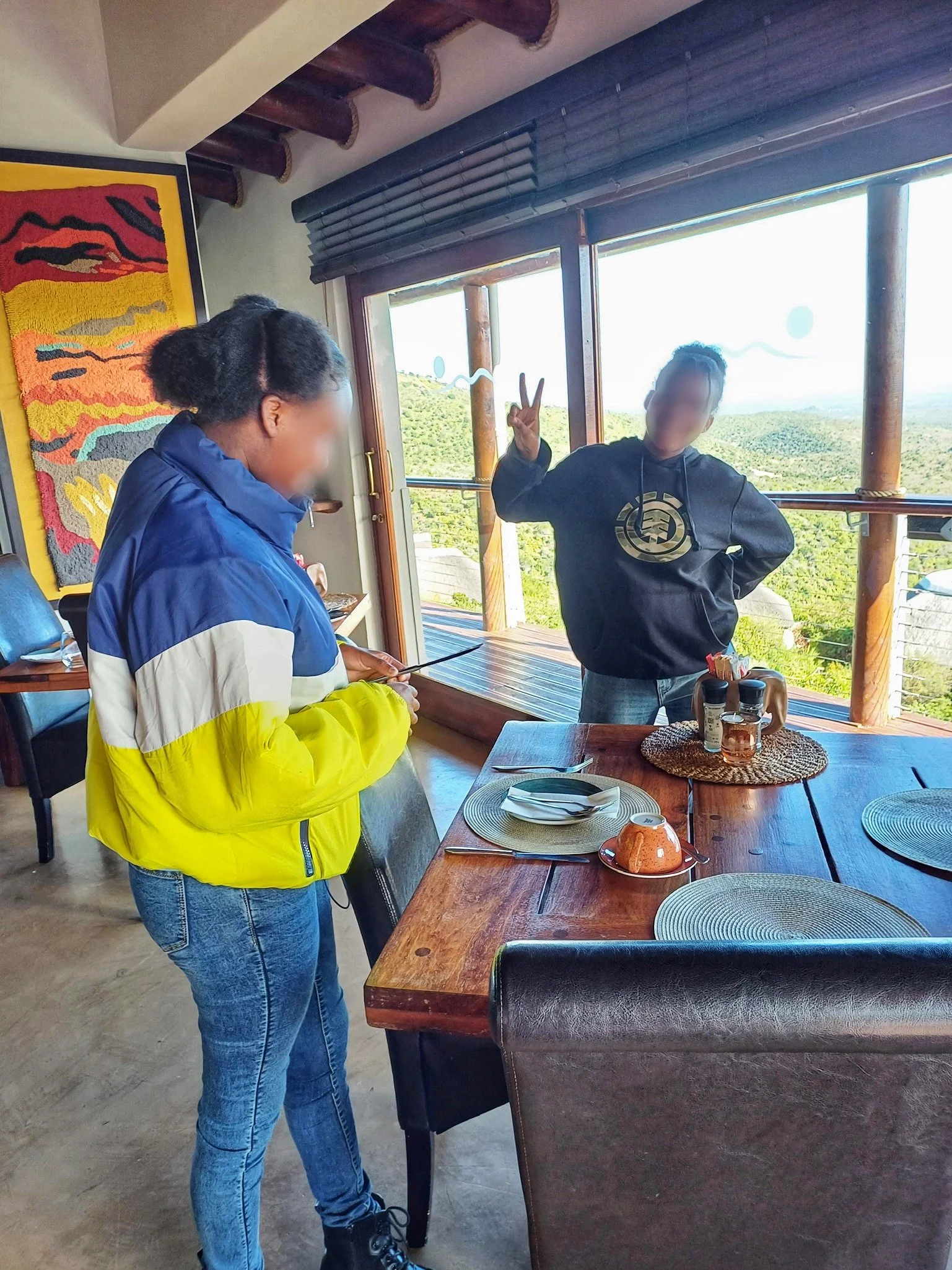 We then headed to lodge reception the proverbial head of the lodge logistics. Mr. Clifford Zono and Mrs. Pumeza Mbunge lead us outside to do a guest arrival role play. I suggested to the girls to take it to the next level and to invent personas for the sake of authenticity, one girl chose to be a Photographer from Canada named Sarah, and the other chose to be Jessica from Germany and she is a model, that way, as they said, it made sense that they are traveling together. We were met by Mr. Zono and taken downstairs to cover all of the introductions and formalities, and Pumeza was waiting to greet them with refreshing towels, we were given a tour of the main building as would be custom for new arrivals. We were led towards the panoramic view of the majestic mountains where two of the wellness therapists were waiting for the girls to give them the famous welcoming hand massages all guests get to enjoy as an added form of relaxation to have the guests feel welcome. The girls seem to enjoy the pampering because I was asked when we would visit that department. I gave the girls another little break as it was almost 15:00 PM.