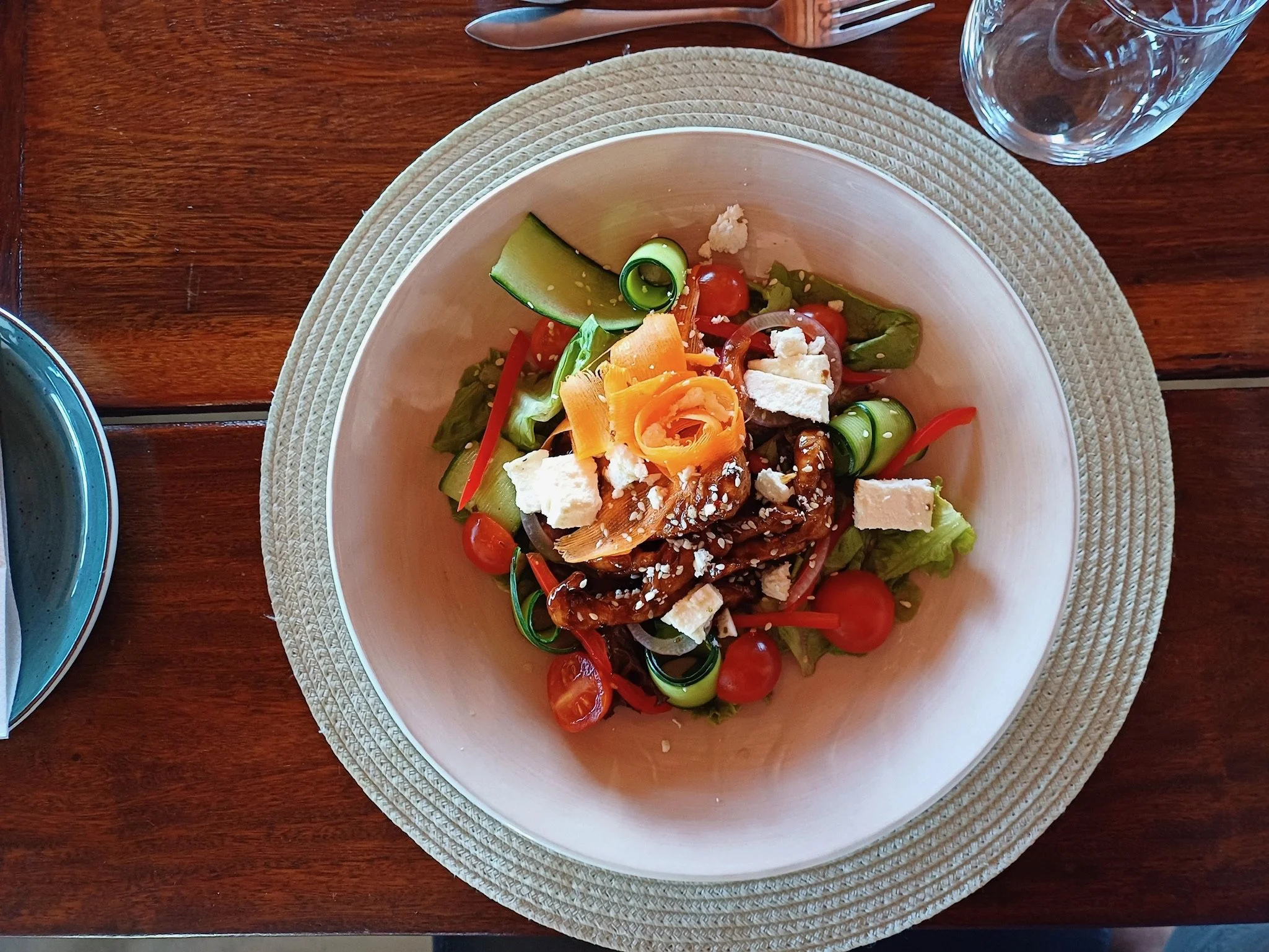 We were introduced to Cinnabon, the head of the kitchen, and she told the girls that they are going to prepare a chicken salad for four people. Nervously they agreed and were shown around the kitchen before starting with the food. Scullery, dry store cold store, bakery, salad section, fish section, meat section and dessert section were all touched on. Hands washed and the prep work started. Cherry tomatoes needed to be cut and cucumber and carrots needed to be peeled and rolled up into roses, onions were being sliced with a mandolin, dressing was created, chicken strips were cut and grilled atop a gas stove with a little flambe flair.